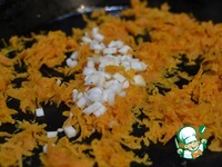 Морковь трем на средней терке, сельдерей режем кубиками. Обжариваем на растительном масле морковь до готовности, затем добавляем сельдерей и прогреваем вместе минут 5-7. |