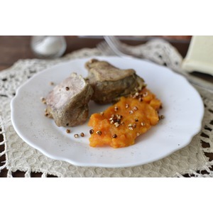 Описание: Нежное мясо утенка отлично сочетается с кисло-сладким овощным гарниром. А хрустящий гречневый попкорн придает блюду контраст и гречишное послевкусие.