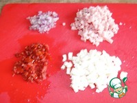 Фиолетовый репчатый лук, ветчину, вяленные томаты и моцареллу очень мелко порезать. |