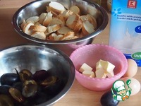 Вчерашние булки или батон тонко нарезать на кусочки размером примерно 3Х3 см, сливы помыть, удалить косточки и порезать на четвертинки. |