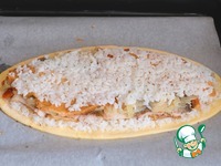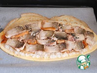 Выложить кусочки рыбы, между ними выложить икру. Блинчики подвернуть к центру кулебяки, тем самым закрыть кусочки рыбы. |