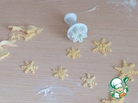У нас остались небольшие кусочки теста, ими можно украсить поверхность кулебяки. Кусочки теста раскатать, вырезать при помощи вырубок для теста снежинки или другие фигурные изделия. |
