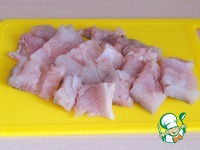 Пока тесто поднимается, приступим к приготовлению начинки для кулебяки. Рыбу почистить, удалить хребет и кости, нарезать кусочками. |