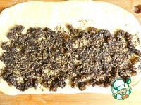 Сворачиваем тесто с начинкой в рулет, перекладываем в форму, накрываем и оставляем на 30-40 минут для подъёма. |
