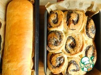 Так у меня получилось два варианта. Подошедшие заготовки можно смазать взбитым яйцом, но я задумала глазировать готовые изделия, поэтому смазала поверхность рулета и булочек молоком. |
