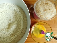 В мучной смеси сделаем углубление и вольём дрожжевую смесь и взбитое яйцо. |