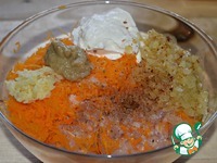 В куриный фарш добавить тыкву, обжаренный лук, горчицу, сметану, измельченный чеснок. Посолить, поперчить по вкусу. Тщательно перемешать фарш. |