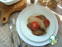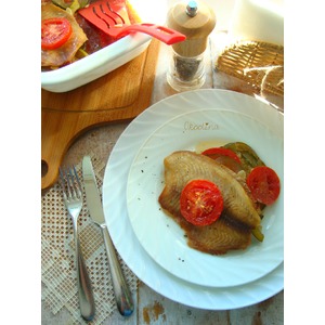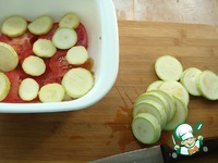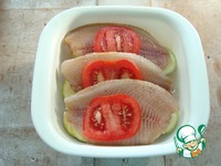 Рыба замариновалась и я её выложила на подушку из овощей: кабачок, помидор. |