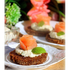 Выложить на тосты рисовый паштет и украсить розочками из малосольной горбуши. Получилась очень вкусная закуска! |