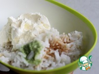Рис отварить до готовности, остудить, добавить творожный сыр, васаби, тертый имбирь и соевый соус. |