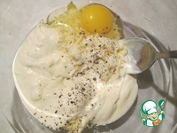 Сметану перемешать с тертым сыром, яйцом, посолить и поперчить. |