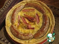 Достаем форму с тестом из холодильника и укладываем в нее обжаренные сосиски. |