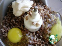 Гречневую кашу пробить в блендере с яйцами и сметаной. |