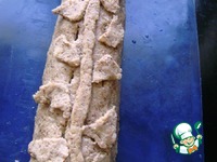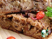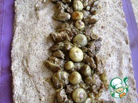 На смазанном маслом силиконовом коврике мокрыми руками разложить гречневое тесто в равномерный прямоугольный пласт. Посередине дорожкой выложить печенку, сверху разложить грибы с луком. |
