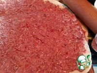 Тесто тонко раскатать, фарш равномерно распределить по поверхности. |