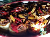 Овощи и грибы обжарить на растительном масле и выложить на ханумчики. Прикрыть форму фольгой и запекать в духовке при t 200° около 30 минут. В конце запекания фольгу снять. |