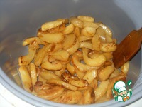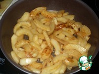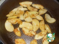 Яблоко нарезаем тонкими дольками, также обжариваем до золотистости с двух сторон. В блюде они незаметны, но добавляют пикантности. |