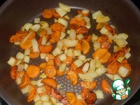 Делаем зажарку. Морковь режем полу- или кольцами. До корочки обжариваем, добавляем крупно нарезанную луковицу, продолжаем обжаривать. |