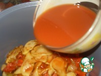 Заливаем наши обжаренные овощи томатным соком. Я в сок добавляю немного сахара. |