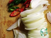 За час до жарки вынуть мясо из холодильника и дать согреться. Лук нашинковать тонко, свежий чили нарезать колечками. |