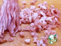 Слегка подмораживаем мясо в морозильнике и режем на кубики довольно мелко.