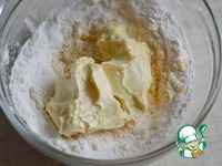 Рисовую муку просеять в чашку. Желтки размешать, добавить к муке. Туда же добавить мягкое масло. |