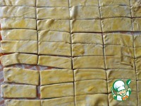 Сверху снова смазываем листы яйцом (или можно смазать уже готовые бантики). Разрезаем на прямоугольники шириной 2-3 см, длиной около 7 см. |