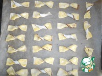 Разогреваем духовку до 180 градусов. Противень застилаем пекарской бумагой. Выкладываем бантики и отправляем их на 10-15 минут в духовку. |