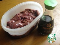 К луку добавить печень вместе с соевым соусом, в котором она мариновалась. Готовить до тех пор, пока не перестанет выделяться сукровица. |