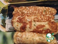 На сковородке не большого диаметра испечь яичные блинчики. |
