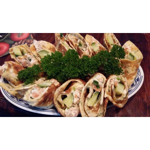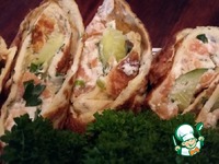 Выложить начинку на блинчик, дополнить ее тонкими ломтиками свежего огурца и свернуть роллы. |