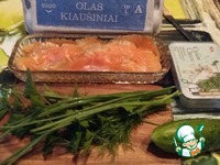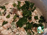 Малосольную рыбу мелко нарезать и смешать с творожным сыром и рубленной зеленью. |