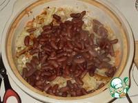 И готовую фасоль. Влить совсем немного воды, все аккуратно перемешать, посолить и поперчить, если требуется, и потушить на небольшом огне до готовности картофеля. |