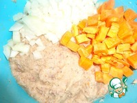 Затем в фарш добавить желатин, нарезанные кусочками лук и морковь. |