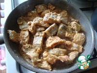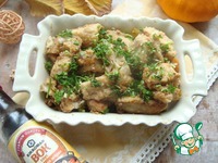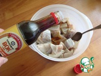 Наливаем соевый соус. Перемешиваем, накрываем крышкой и даём помариноваться минут 15-20. |