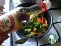 Выкладываем к овощам брокколи и наливаем соевый соус. Перемешиваем и тушим 15 минут. |