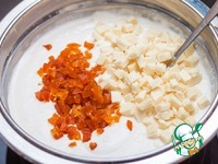 Добавить курагу и белый шоколад, нарезанные небольшими кусочками, перемешать. Шоколад у меня был ванильный, поэтому ванильную эссенцию не добавляла. |