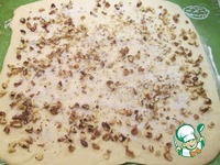 Тесто после подъема еще немного вымесить и раскатать в прямоугольник со сторонами примерно 30 x 40 см. Смазать тесто растопленным маслом, посыпать рубленными орехами и сахаром. |