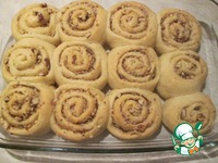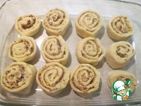 Свернуть в тугой рулет и разрезать на части толщиной 2,5 - 3 см. Положить булочки срезом вверх в смазанную маслом форму и оставить для подъема минут на 30. |