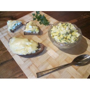 Яйца сварить вкрутую, остудить, очистить, порубить не очень крупно. Петрушку мелко порезать, смешать с яйцами, заправить майонезом, посолить и поперчить. |