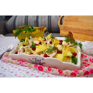 Описание: Да - очередной вариант куриного салата с ананасами... но, поверьте мне, от этого он не станет менее вкусным... это что-то - сочные ломтики ананаса, хрустящая капуста и лопающиеся на зубах кисленькие ягоды клюквы... ммммм...