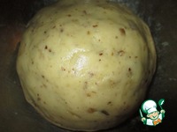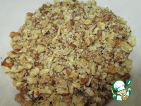 Грецкие орехи измельчить на мелкие кусочки любым удобным способом (я скалкой это сделала). Но не в муку. |