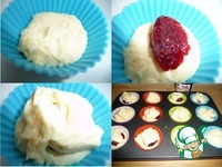 Формы для кексов смазать сливочным маслом, силиконовые не смазывать. В формочки выложить 1 ст. л. теста, затем неполную чайную ложку конфитюра, сверху снова тесто 1ст. л. Формы заполнить на 3/4. |