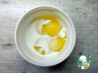 В порционную пиалу аккуратно разобьем 2 яйца и нальем к яйцам сливки. |