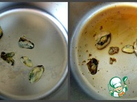 Кладем в сотейник мидии, накрываем крышкой на 15-20 секунд, затем открываем крышку, добавляем вино и тушим мидии в вине, не накрывая крышкой пока вино не выпарится. |