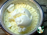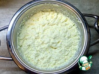 В заварную яично-молочную смесь выкладываем творог и тщательно смешиваем. |