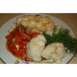4. Запекать рыбу с овощной шубой в течение 50-70 минут. Затем запеченную пикшу с овощами полить разведенной в небольшом количестве воды томатной пастой «Помидорка», посолить, добавить другие специи и вновь убрать в жаровой шкаф. При этом температуру следует повысить до 200 С и выпекать в таком режиме еще 12-15 мин.