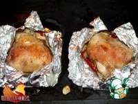 7. Затем осторожно разрезать фольгу по середине, в виде лепестков, немного раскрыть, смазать куриное бедро оливковым маслом и дать запечься сверху под грилем до вкусной и румяной корочки. |