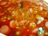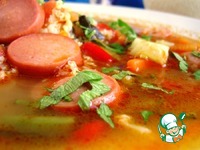 Опустить пассеровку, добавить нарезанные кружочками сосиски. Дать закипеть. Посолить по вкусу, всыпать зелень и пряности. Выключить и дать настояться под крышкой 15 минут. |