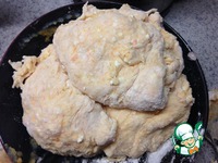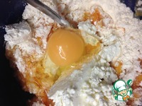 Просеять муку и крахмал в миску, добавить два вида пюре. Добавить творог. Вбить яйцо и желток. |